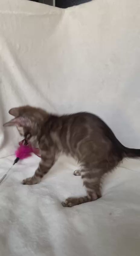 Meet this stunning Bengal male with a striking black amber spotted tabby coat. This kitten showcases the breed's signature wild appearance with bold, high-contrast markings and a muscular build. Bengal cats are known for their intelligence, athleticism, and engaging personalities—they're interactive companions that thrive on play and mental stimulation. This particular male displays excellent type and coloring, making him an exceptional choice for those seeking a Bengal with authentic breed characteristics. Expect a confident, affectionate cat with the distinctive spotted pattern that makes Bengals so visually captivating.