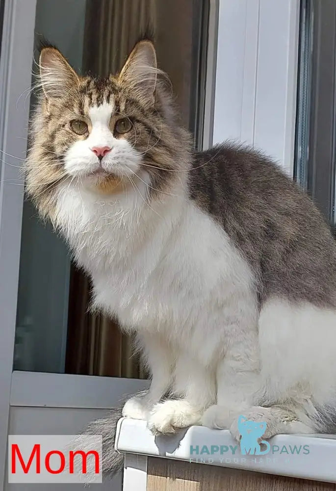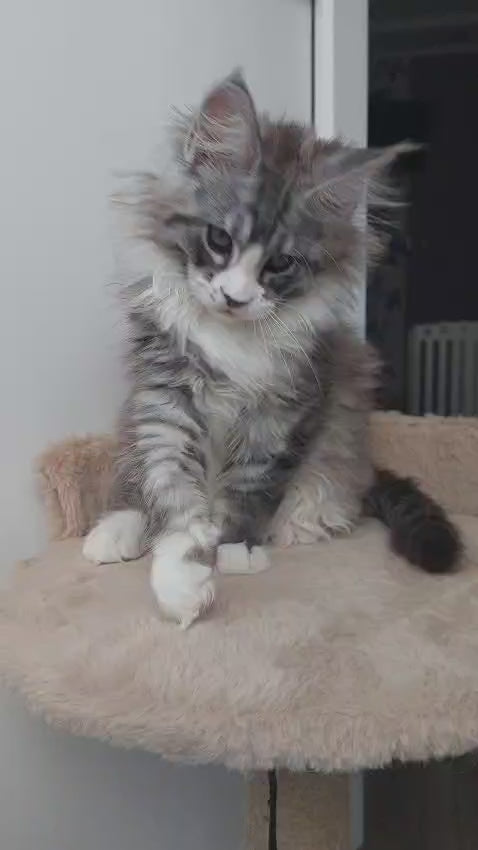Meet Geisha, an exquisite female Maine Coon showcasing the striking black silver with white tabby pattern. This majestic breed is renowned for its impressive size, intelligent temperament, and luxurious coat. Maine Coons are known for their gentle, sociable nature and adaptability to family life. Geisha's distinctive coloring combines deep charcoal tones with silvery highlights and crisp white markings, creating a truly captivating appearance. These cats are excellent companions, displaying playful curiosity and affectionate behavior while maintaining their independent spirit. Ideal for experienced cat enthusiasts seeking a premium, pedigreed feline with exceptional beauty and personality.