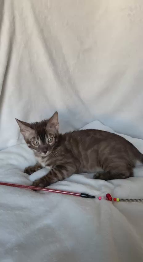 Meet Gelios, an exceptional Bengal male showcasing the striking black amber spotted tabby pattern that defines this prestigious breed. With his distinctive spotted coat and athletic build, Gelios embodies the wild elegance characteristic of Bengals while maintaining a devoted, affectionate temperament. His vibrant amber coloring contrasts beautifully with deep black markings, creating the coveted spotted pattern prized by enthusiasts. Ideal for experienced cat owners seeking an intelligent, active companion with remarkable personality and stunning aesthetics.