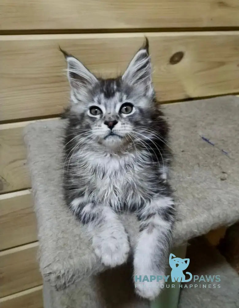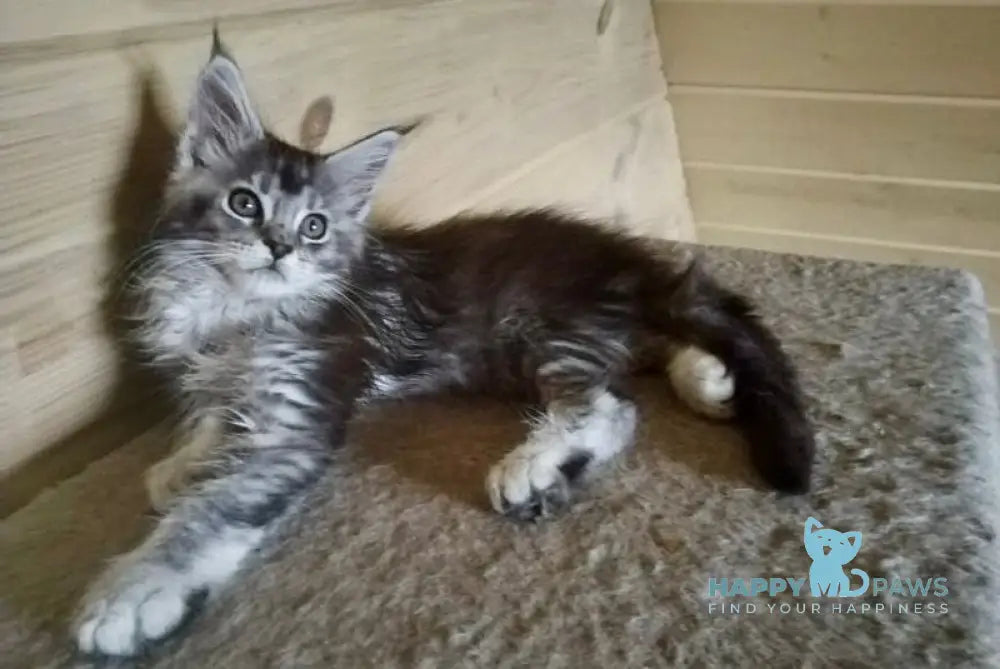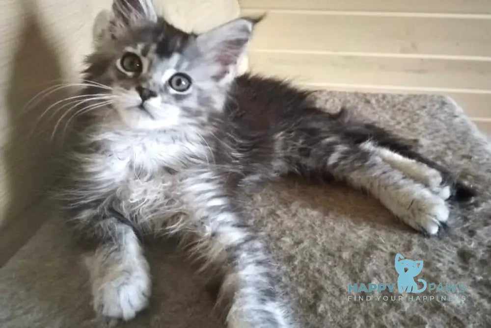 Germes is a distinguished male Maine Coon with a striking black silver ticked tabby coat. Known for their robust build and gentle temperament, Maine Coons like Germes combine impressive size with a friendly, intelligent nature. His unique coloration highlights the breed’s classic tabby pattern with a shimmering silver overlay, making him a remarkable example of Maine Coon genetics. Ideal for enthusiasts seeking a majestic and sociable companion, Germes embodies the breed’s signature blend of beauty and character.