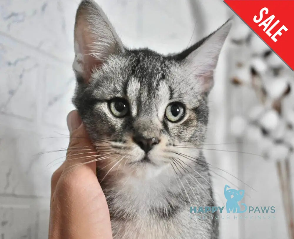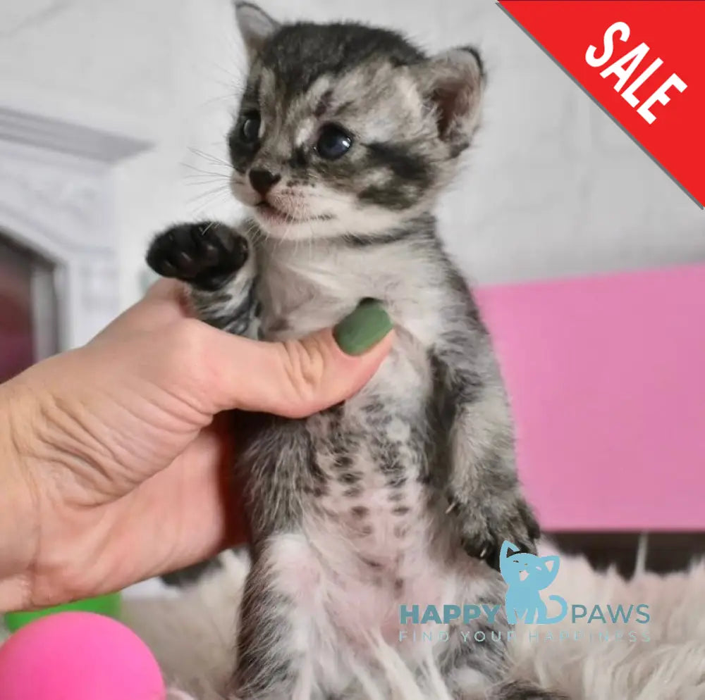 The Ghost Chausie F1 male kitten features a striking grizzled ticked coat, showcasing the breed’s wild heritage with a refined domestic temperament. As a first-generation Chausie, this male combines the agility and curiosity of its wild ancestors with the affectionate nature of a domestic cat. Ideal for experienced cat enthusiasts, this kitten promises an engaging and active companion with a unique, eye-catching appearance.