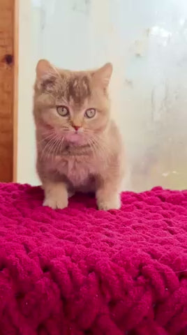 Gin is a handsome British Shorthair male with a warm cinnamon ticked tabby coat that gives him a refined, shimmering look. His round eyes and plush build showcase the breed’s signature charm. Calm, observant, and affectionate, he enjoys peaceful company. A uniquely colored gentleman with a soft, steady temperament.