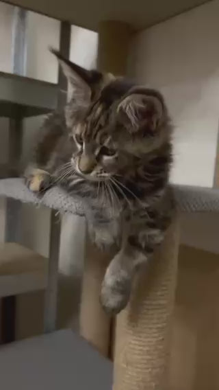 A ginger Maine Coon female with a black tortie tabby pattern has a striking blend of warm copper tones and dark, smoky patches. Her large tufted ears and fluffy tail give her an elegant, wild look. Gentle and affectionate, she often follows her favorite people around the house. With her expressive amber eyes, she easily becomes the center of attention.