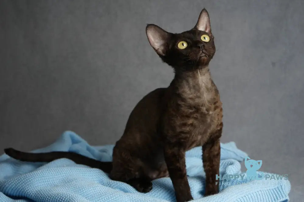 Gloria is a stunning female Devon Rex with a sleek black coat that showcases this breed's distinctive characteristics. Known for their elfin features, oversized ears, and soft, wavy fur, Devon Rex cats are intelligent, playful, and deeply affectionate companions. Gloria combines the breed's signature charm with an elegant dark appearance, making her a captivating addition to any home. Devon Rex cats thrive on human interaction and are known for their dog-like loyalty and entertaining personalities. Perfect for families or individuals seeking an engaging, devoted feline companion with a truly unique look.