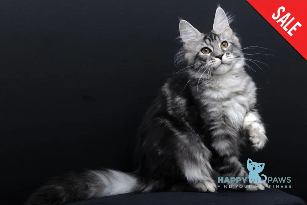 The Goodwin Maine Coon female in black silver tabby showcases the breed’s signature large, muscular frame and luxurious, dense coat with striking silver tabby markings. Known for their intelligence and gentle temperament, this Maine Coon offers both beauty and a calm, affectionate nature, making her an excellent companion for experienced cat enthusiasts seeking a distinguished and sociable feline.