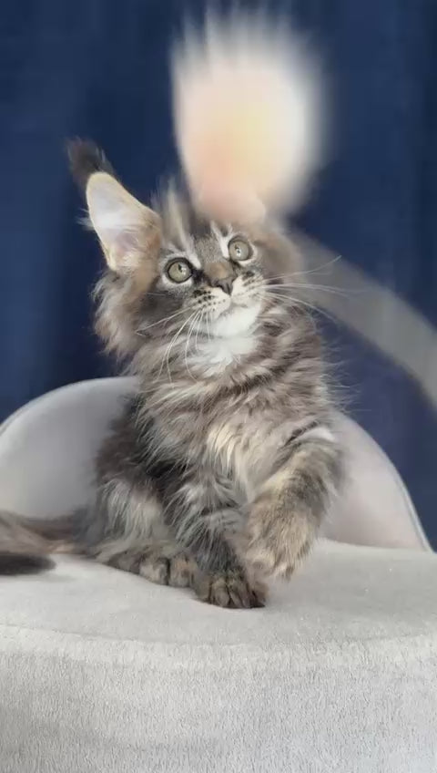 Golda is a stunning female Maine Coon with a beautiful black ticked tabby coat. Known for their impressive size and gentle temperament, Maine Coons like Golda make wonderful companions. Her distinctive ticked tabby pattern showcases the breed's natural elegance and striking appearance. Maine Coons are intelligent, playful, and affectionate cats that thrive in family environments. Golda's breed characteristics include a muscular build, tufted ears, and a luxurious long coat that requires regular grooming. Perfect for cat enthusiasts seeking a loyal, engaging feline companion with classic Maine Coon charm.