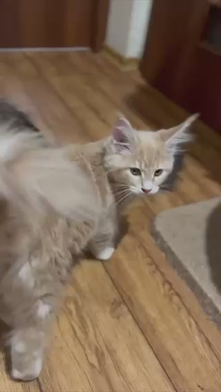 Goldie is a stunning female Maine Coon displaying the classic cream tabby pattern that defines this majestic breed. Maine Coons are renowned for their impressive size, intelligence, and gentle temperament, making them exceptional companions for families and experienced cat enthusiasts alike. Goldie's luxurious long coat and distinctive tabby markings showcase the breed's natural beauty. Maine Coons are known for their playful, affectionate nature and adaptability to various living environments. This particular female represents the breed's characteristic charm—sociable, curious, and devoted to her human companions. Ideal for those seeking a loyal, engaging feline friend with striking presence and a warm personality.