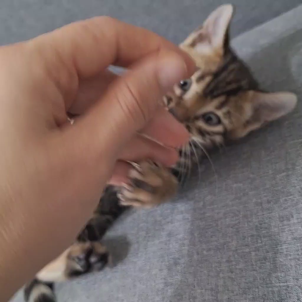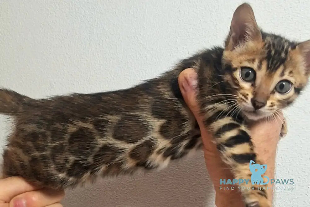 Goldy is a striking female Bengal cat with a sleek black spotted tabby coat, showcasing the breed’s signature exotic pattern. Known for their intelligence and playful nature, Bengals like Goldy make engaging and affectionate companions. Her distinctive markings highlight her strong lineage, making her a captivating addition to any home seeking an elegant and energetic feline friend.