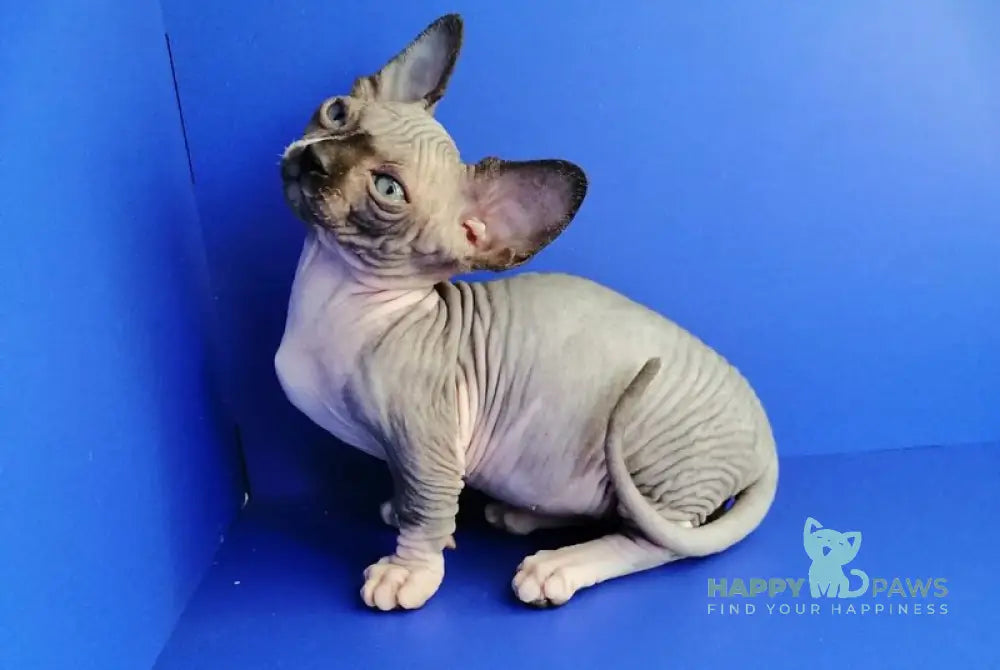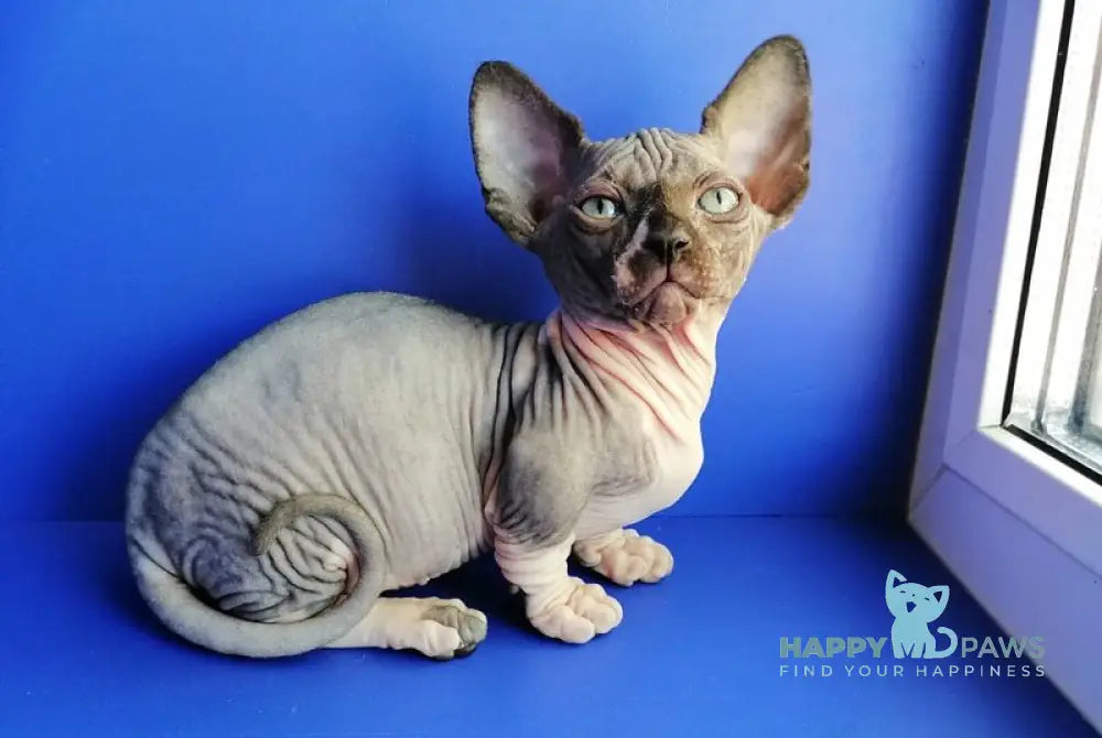 The Gray Bambino male with black bicolour presents a distinctive combination of sleek gray fur accented by striking black patches. Known for its affectionate nature and minimal coat, this breed offers a unique appeal to experienced cat owners seeking a low-maintenance yet expressive companion. Its characteristic appearance and gentle temperament make it an excellent choice for those familiar with specialized feline care.