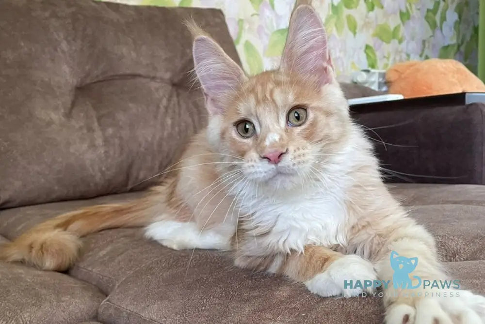 The Grom Maine Coon male showcases the striking red silver tabby with white coat, a hallmark of this majestic breed. Known for their robust build and gentle temperament, Maine Coons like Grom combine impressive size with a friendly, intelligent nature. This coloration highlights the breed’s distinctive tabby pattern enhanced by a silvery sheen and crisp white accents, making Grom a standout example of Maine Coon elegance and charm. Ideal for those seeking a sociable and visually captivating companion.
