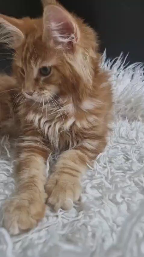 Guru is a striking red tabby and white Maine Coon male, embodying the breed's renowned intelligence and gentle temperament. Maine Coons are celebrated for their substantial size, muscular build, and distinctive tufted ears, making them commanding yet affectionate companions. Guru's vibrant red tabby markings combined with white accents showcase the classic beauty of this majestic breed. Known for their sociable nature and adaptability, Maine Coons thrive in family environments and bond deeply with their owners. This breed excels as both a devoted household member and an engaging personality, offering the perfect balance of independence and companionship for discerning cat enthusiasts.