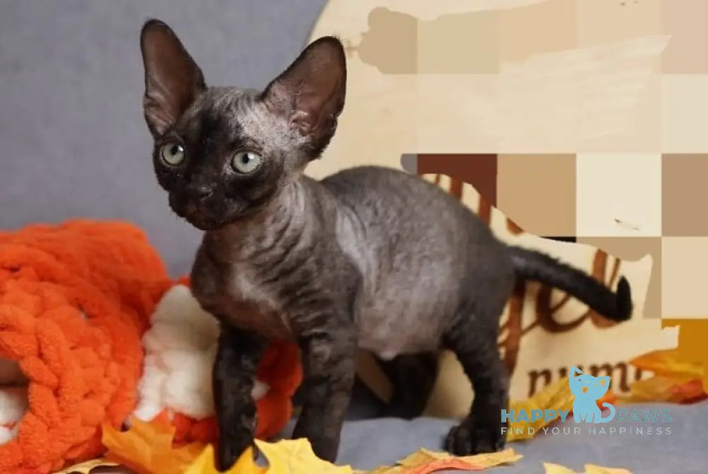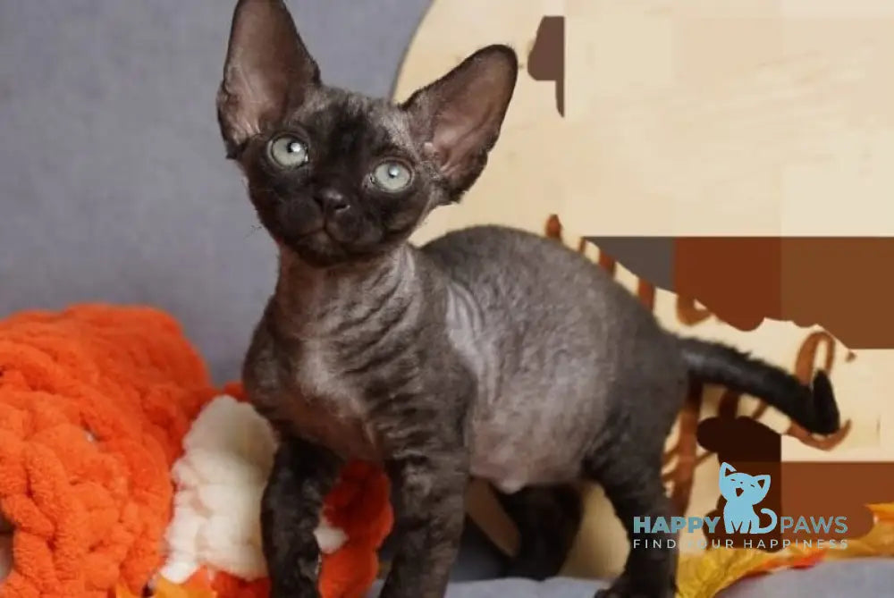 Harry is a distinguished male Devon Rex with a sleek black coat, showcasing the unique curly fur and large ears characteristic of the breed. Known for their affectionate and intelligent nature, Devon Rex cats like Harry adapt well to various environments, offering companionship and playful energy. His hypoallergenic coat makes him an excellent choice for those with mild allergies, while his sturdy yet agile build ensures active engagement and graceful movements. Harry represents the hallmark qualities of the Devon Rex breed with elegance and charm.