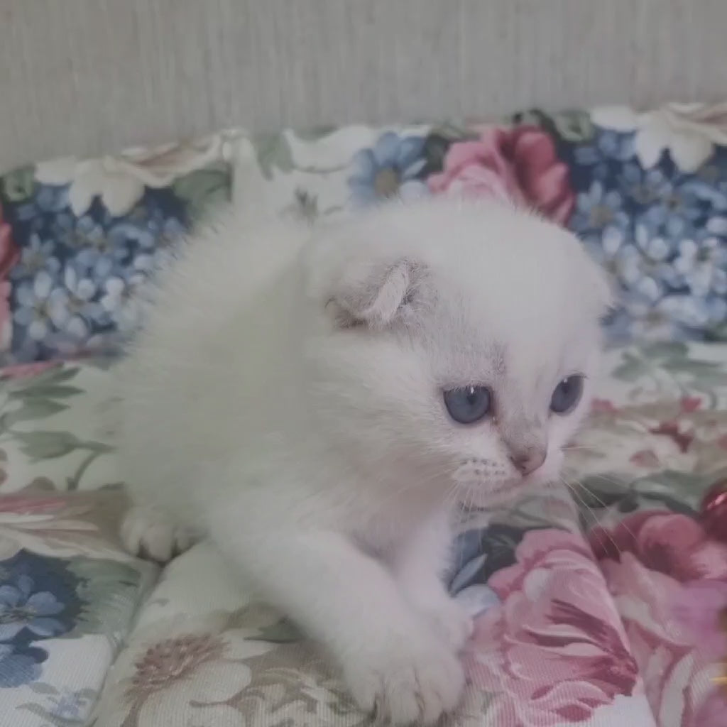 The Hassi Scottish Fold female showcases the breed’s signature folded ears and plush coat, distinguished by a striking black silver shaded pointed pattern. This elegant coloration highlights subtle gradients from dark tips to silvery underlayers, emphasizing her refined features. Known for their calm and affectionate nature, Scottish Folds make exceptional companions, combining distinctive appearance with a gentle temperament. Ideal for cat enthusiasts seeking a blend of unique aesthetics and loving personality.