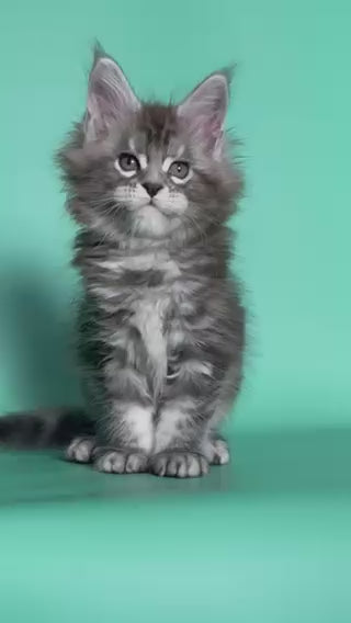 Hazel is a beautiful Maine Coon female with a striking black silver tabby coat that accentuates her majestic appearance. Her expressive eyes and gentle demeanor reflect the breed’s friendly and affectionate nature. Playful yet calm, she enjoys both attention and quiet moments. Hazel’s elegance and warm personality make her truly captivating.