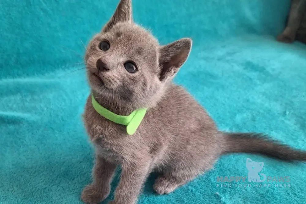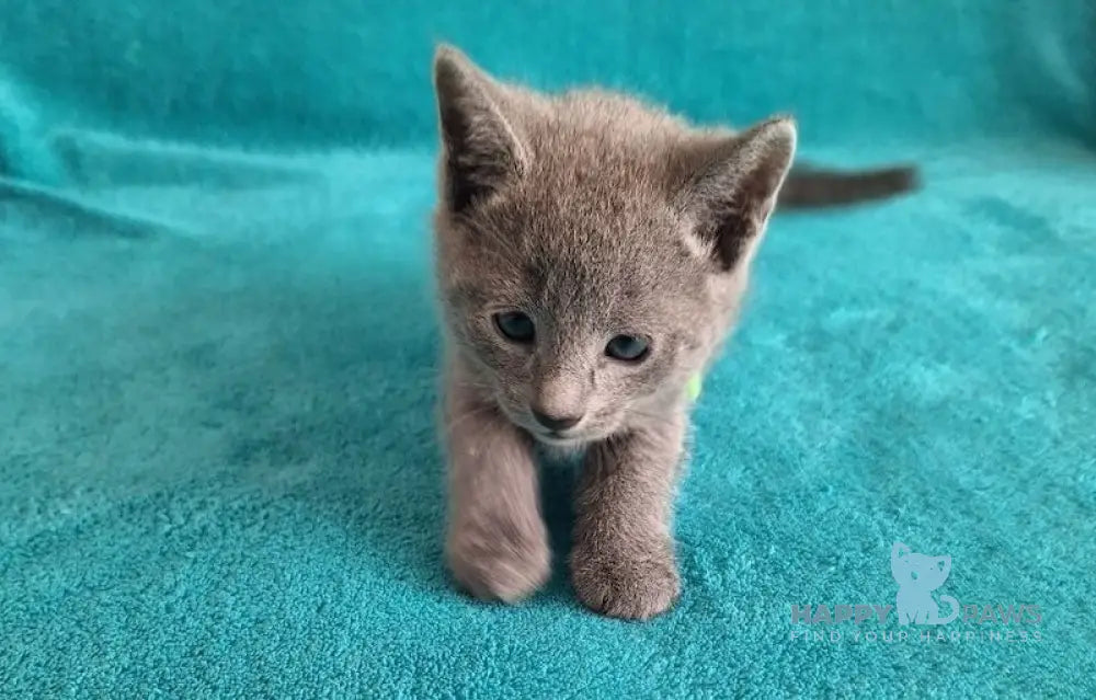 Hermes is a striking male Russian Blue kitten, distinguished by his dense, silvery-blue coat and vivid green eyes. Known for their gentle and intelligent nature, Russian Blues like Hermes are affectionate companions with a quiet demeanor. His elegant appearance and calm temperament make him an excellent addition to a discerning home seeking a loyal and low-maintenance feline friend.