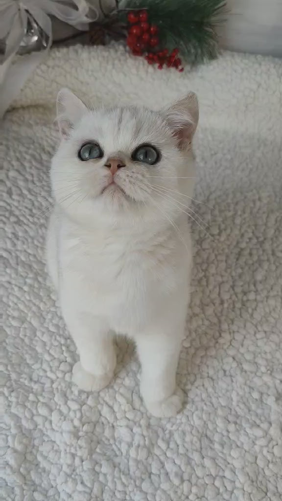 Meet Hugo, a stunning British Shorthair male showcasing the coveted black silver shaded coat pattern. This breed is renowned for its robust build, round face, and dense double coat that feels luxuriously plush to the touch. Hugo displays the characteristic calm, affectionate temperament British Shorthairs are celebrated for—making him an ideal companion for families and individuals alike. His striking silver-tipped fur creates a luminous appearance that deepens to black at the roots, a hallmark of the shaded variety. British Shorthairs are known for their independence balanced with genuine fondness for their humans, thriving in stable home environments where they can express their naturally curious and playful nature.