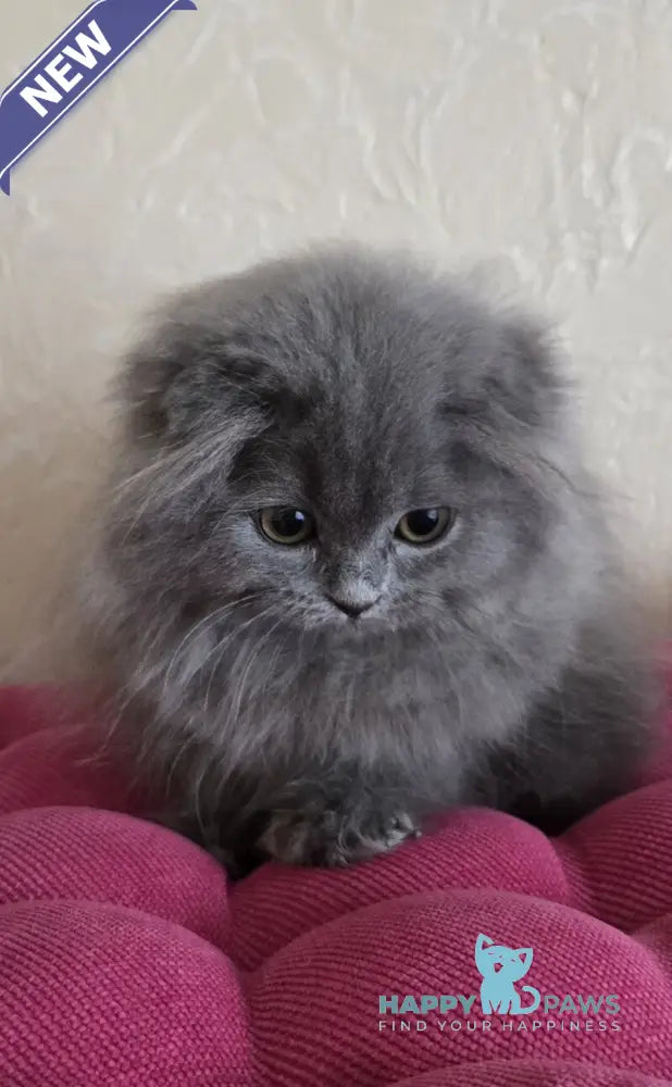 Hugo is a stunning Scottish Fold male with a distinctive blue-gray coat that showcases the breed's elegant appeal. Scottish Folds are renowned for their unique folded ears, sweet temperament, and intelligent nature, making them exceptional companions for families and individuals alike. Hugo's blue coloring is a prized trait, featuring a soft, silvery-gray hue that highlights his striking features. This breed thrives on human interaction and affection, adapting well to various living environments. Scottish Folds are known for their playful yet calm demeanor, combining entertainment value with a relaxed household presence. Hugo represents the finest qualities of the breed—beauty, personality, and devoted companionship.