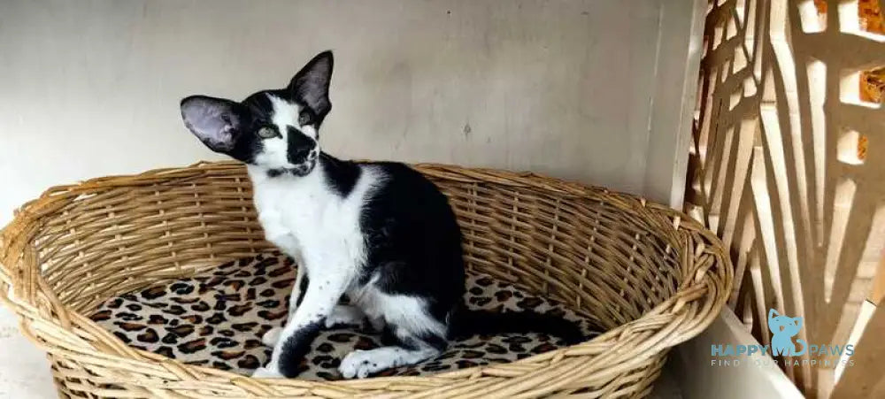 Iracly is a striking Oriental Shorthair male with a bold black bicolour coat that highlights his sleek, elegant build. His large ears and vivid, almond-shaped eyes give him a sharp, expressive look full of character. Curious and energetic, he loves to explore and stay close to his people. At the same time, Iracly is affectionate and loyal, always ready to share his warmth and charm.