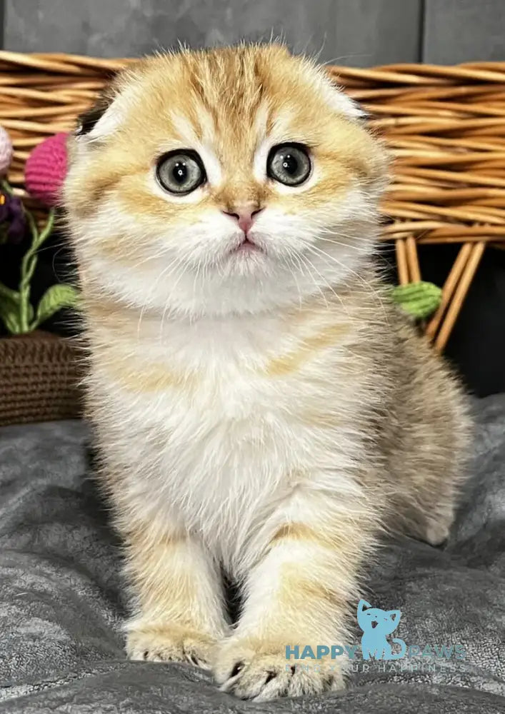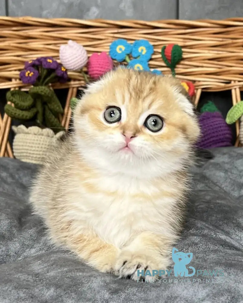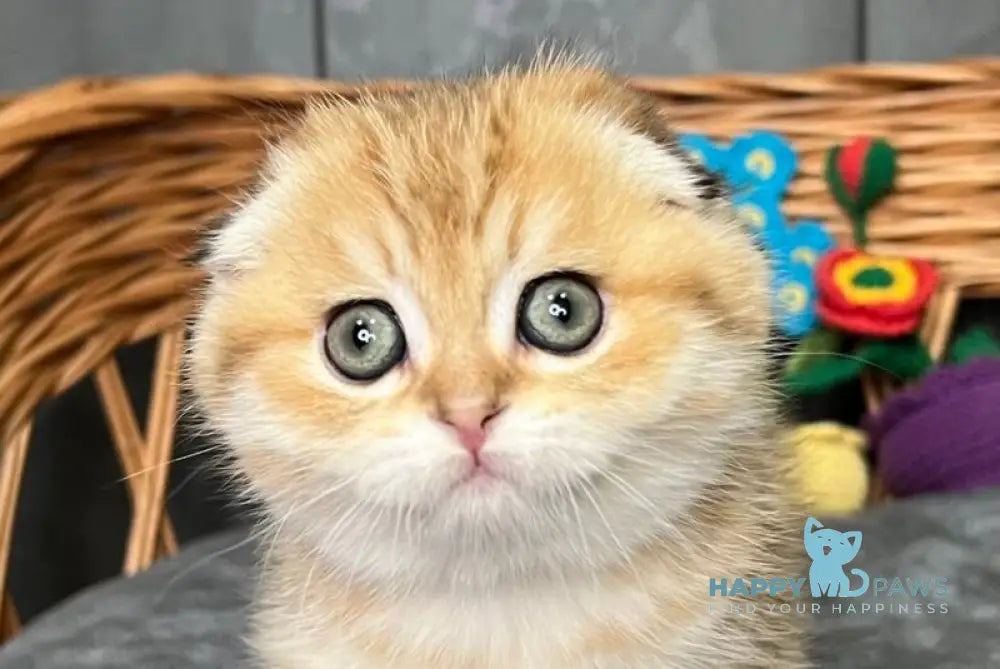 Iris is a captivating black golden spotted tabby female with the distinctive folded ears of a Scottish Fold. Her rich golden tones shimmer beneath bold dark spots, creating a luxurious and eye-catching coat. With her round eyes and soft expression, she has a sweet yet curious look. Iris is gentle, affectionate, and brings warmth and elegance to any home.