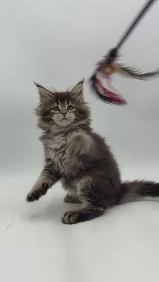 Irma is a beautiful Maine Coon female with a classic black tabby coat. Her tufted ears, expressive eyes, and luxurious fur give her a striking, majestic appearance. Gentle and affectionate, she enjoys both playful moments and quiet cuddles. Intelligent and curious, she loves exploring her surroundings. Her combination of elegance, softness, and sweet temperament makes her truly special.
