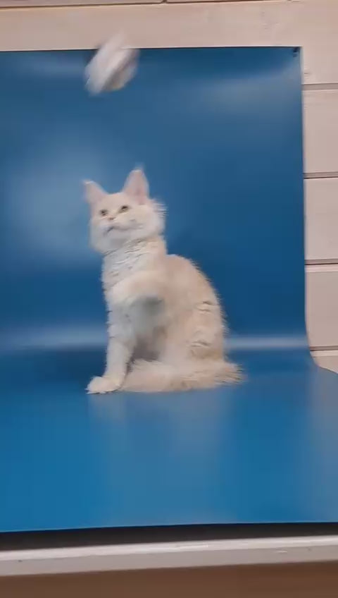 Irvin is a striking male Maine Coon displaying the coveted cream silver coat pattern. This majestic breed is renowned for its impressive size, intelligent temperament, and gentle disposition. Maine Coons excel as family companions, combining playful energy with calm, affectionate behavior. Irvin's luxurious cream silver coloring showcases the breed's natural beauty and distinctive appearance. Known for their adaptability and social nature, Maine Coons thrive in various living environments and bond deeply with their families. Irvin represents the finest qualities of this beloved breed—a loyal, engaging companion with the characteristic charm Maine Coons are celebrated for.
