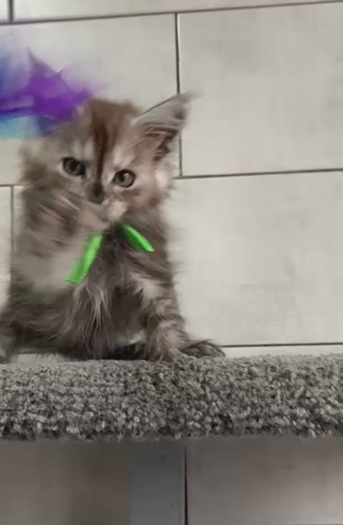 Ishim is a Maine Coon polydactyl male with a beautiful black silver coat. His extra toes add to his charm, giving him a unique and majestic appearance. Gentle, confident, and affectionate, Ishim embodies the strength and grace typical of the Maine Coon breed.