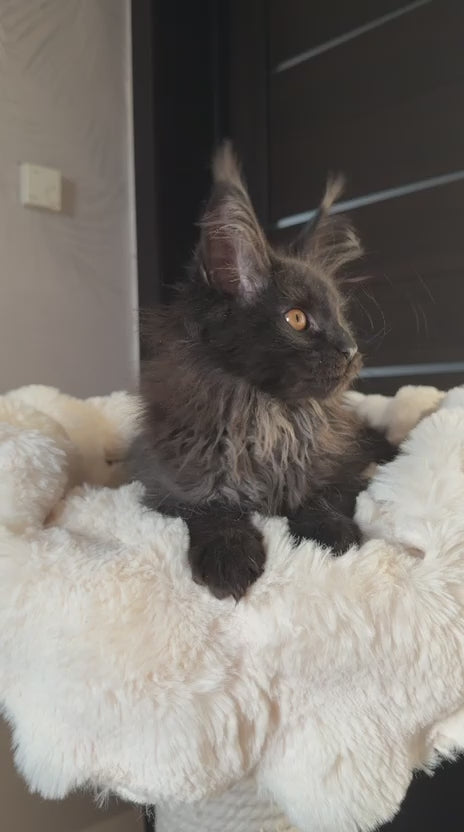 Iskra represents the pinnacle of Maine Coon breeding excellence. This striking female showcases the breed's signature black silver coat, featuring luxurious long fur with distinctive silver tipping that creates exceptional depth and dimension. With the characteristic robust build, tufted ears, and expressive eyes Maine Coons are renowned for, Iskra embodies both beauty and substance. Her pedigree reflects generations of careful selection for health, temperament, and conformation. Ideal for discerning breeders or those seeking a companion with authentic Maine Coon presence and aristocratic bearing.