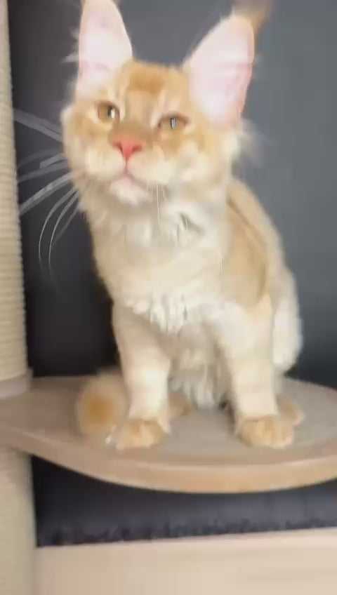 Meet Issac, a striking red silver Maine Coon male with the breed's signature robust build and luxurious coat. Maine Coons are renowned for their gentle temperament, intelligence, and affectionate nature, making them exceptional companions for families and individuals alike. Issac's distinctive coloring showcases the breed's natural beauty, while his size and strength reflect the Maine Coon's impressive stature. Known for their playful yet calm demeanor, Maine Coons like Issac thrive on interaction and adapt well to various living environments. His pedigree and coloring make him a remarkable addition to any home seeking a loyal, engaging feline companion.
