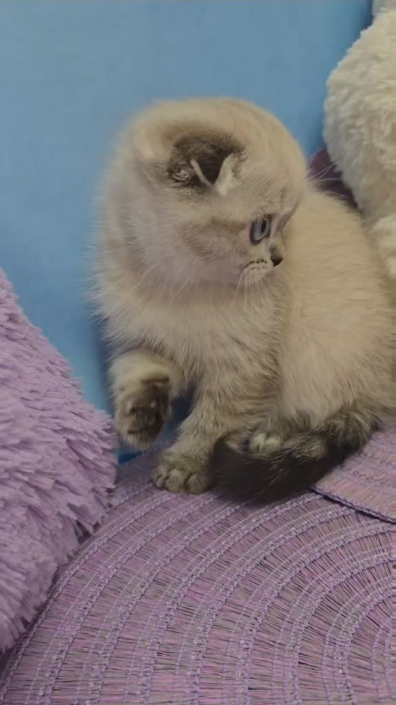 Ivan is a striking Scottish Fold male with a distinctive black tabby pointed coat pattern. This breed is renowned for its unique folded ears, which give these cats an endearing, owl-like appearance. Ivan's tabby markings combined with pointed coloring create a sophisticated aesthetic. Scottish Folds are known for their gentle, affectionate temperament and adaptability to various living environments. They typically enjoy human companionship and make excellent family pets. Their moderate activity level and calm demeanor make them well-suited for both active and quieter households. Ivan represents the breed's characteristic charm and would make a wonderful addition to any cat-loving home.