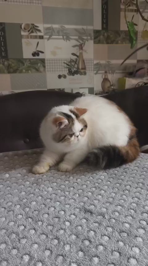 Ivanka Exotic female, black tortie tabby harlequin represents a striking feline specimen with distinctive coloring and breed characteristics. This female exotic cat displays the breed's signature compact build, rounded features, and plush coat in an elegant red bicolour pattern. Known for their calm, affectionate temperament, Exotic cats make devoted companions that thrive in indoor environments. Ideal for experienced cat enthusiasts seeking a low-maintenance yet engaging pet with a gentle disposition and minimal grooming demands compared to their Persian ancestors.
