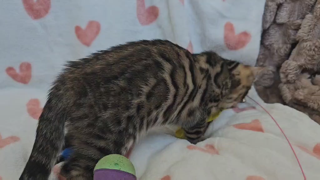 Ivy is a female Bengal cat distinguished by her sleek black spotted tabby coat, showcasing the breed’s signature wild and elegant appearance. Known for their intelligence and energetic nature, Bengals like Ivy are affectionate companions who thrive in active households. Her striking pattern and playful temperament make her an exceptional choice for those seeking both beauty and engaging interaction in a pet.