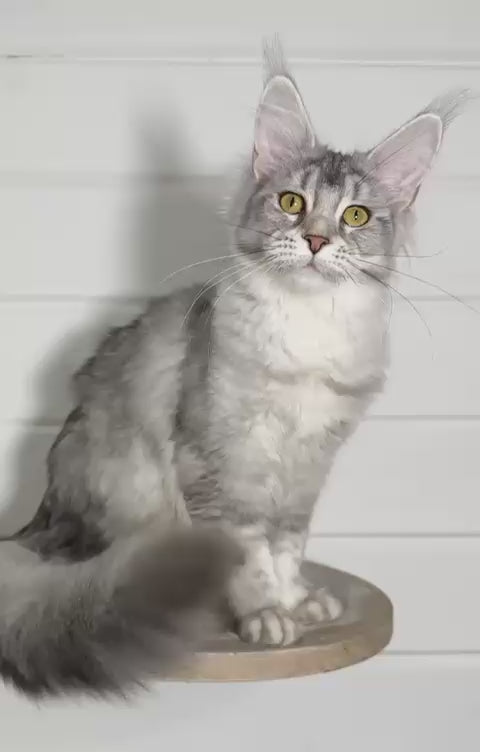 Izzi is a captivating Maine Coon female with a striking black silver ticked tabby coat that glows with subtle shimmer. Her tufted ears and bright, expressive eyes give her a refined, elegant look. Curious and affectionate, she enjoys exploring her surroundings and relaxing near her humans. Izzi brings both beauty and warmth to any home.