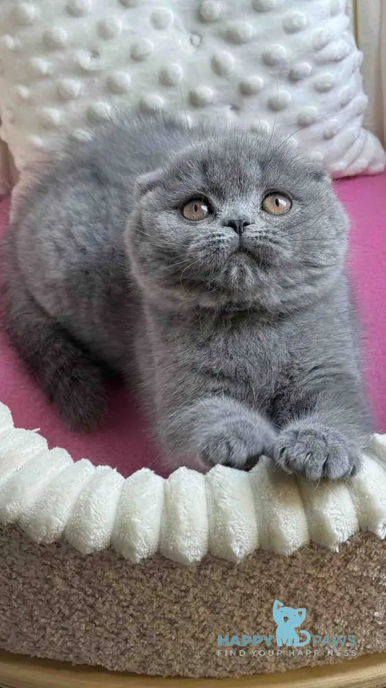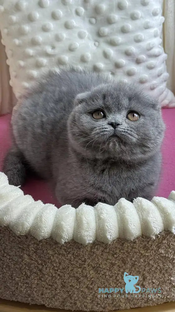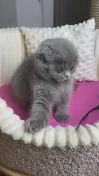 Meet Jasmine, a stunning blue Scottish Fold female with the breed's signature folded ears and gentle temperament. Scottish Folds are known for their sweet, affectionate nature and adaptability to various living environments. Jasmine's striking blue coat showcases the breed's distinctive coloring, while her calm demeanor makes her an excellent companion for families and individuals alike. This intelligent and playful girl will bring charm and warmth to your home. Scottish Folds thrive on human interaction and make devoted, loving pets.