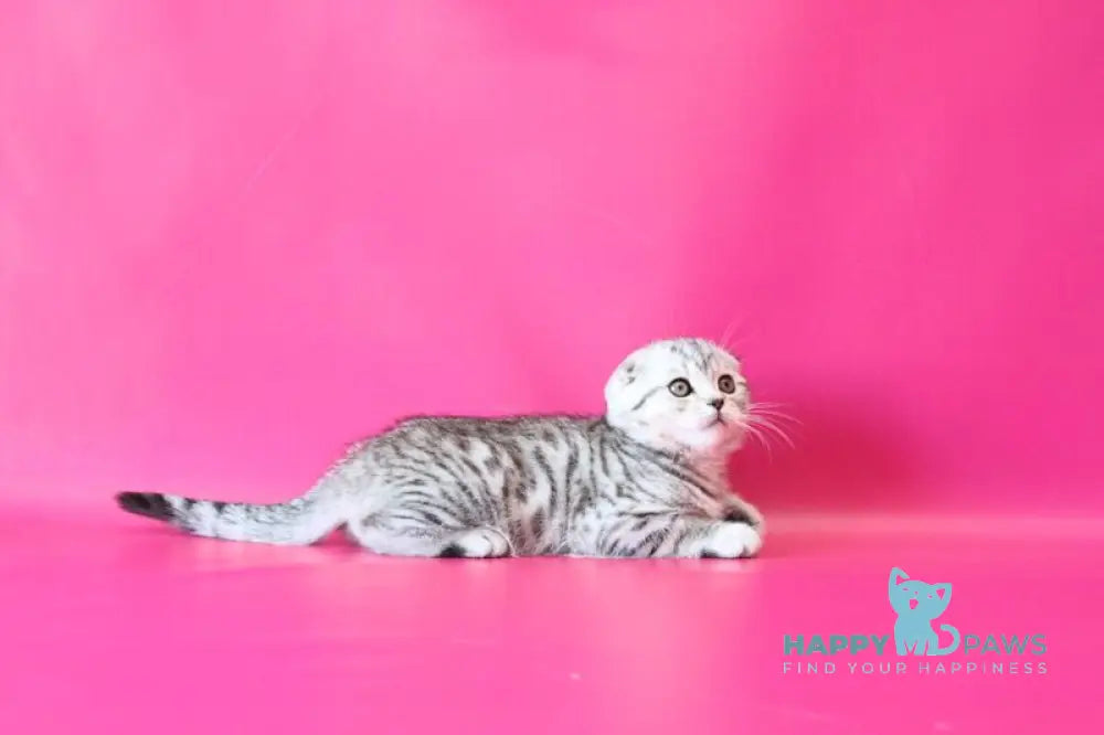 Meet Justin, a stunning Scottish Fold male with a striking black silver spotted tabby coat. This breed is renowned for its distinctive folded ears, which give these cats an endearing, owl-like appearance. Justin combines the Scottish Fold's characteristic sweet temperament with the bold markings of his tabby pattern, creating a visually captivating companion. Scottish Folds are known for their gentle, adaptable nature and affectionate personalities, making them excellent family pets. Justin's unique coloring and breed characteristics make him a truly special addition to any home seeking an intelligent, loving feline friend.