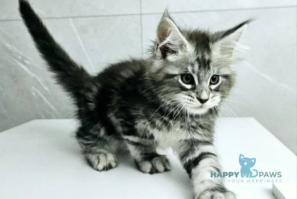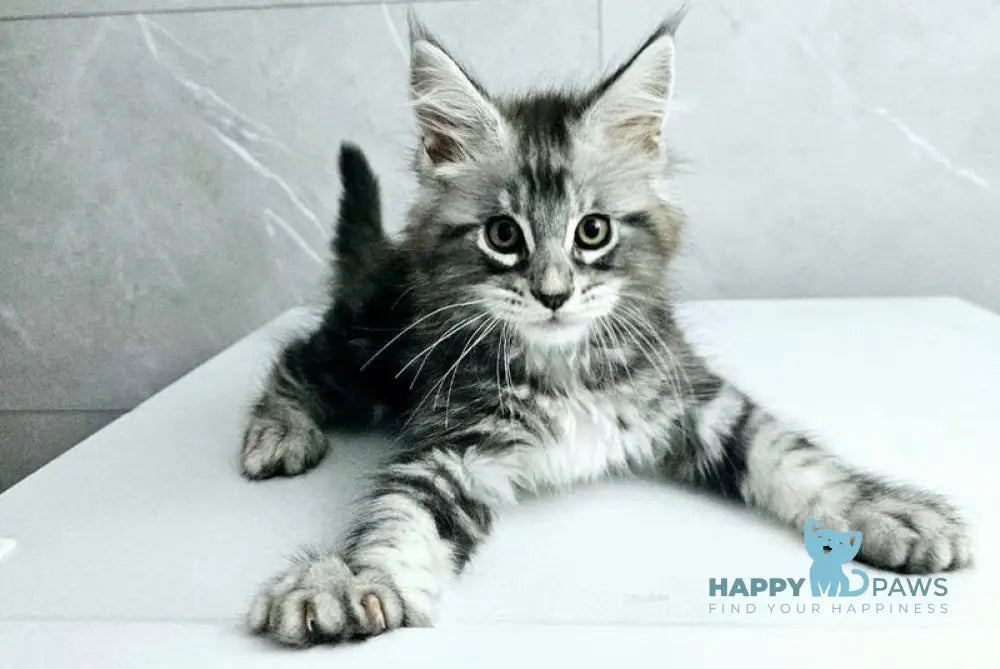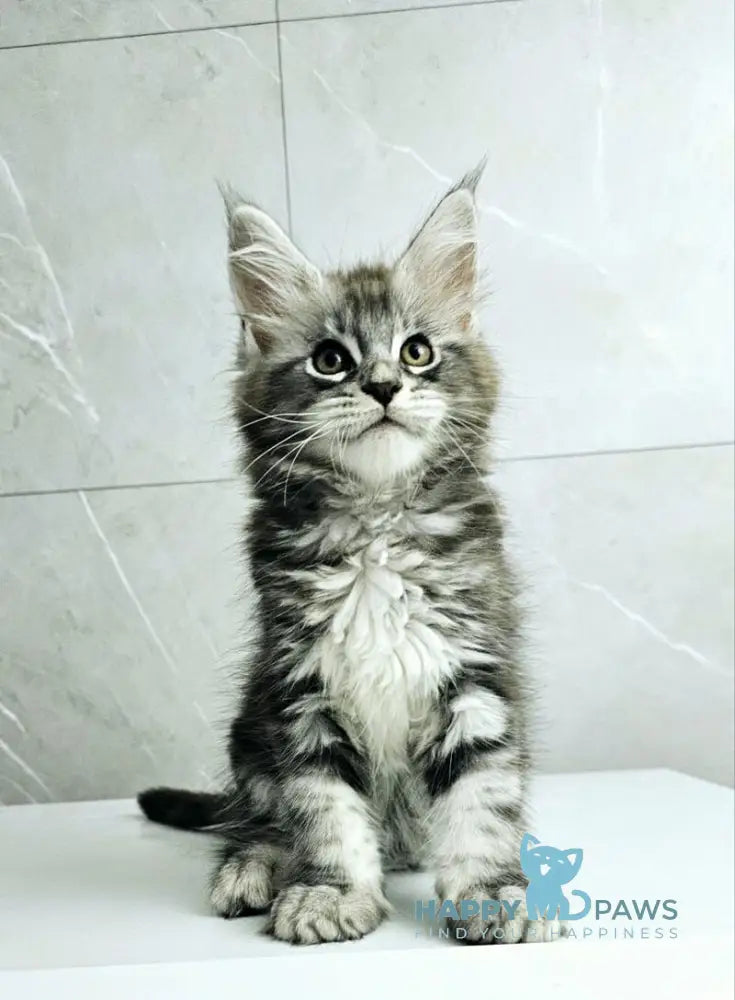 Kaif is a distinguished Maine Coon male showcasing the striking black silver tabby pattern typical of this breed. His robust build and luxurious coat reflect the breed’s characteristic strength and beauty. Known for their intelligence and gentle nature, Maine Coons like Kaif make excellent companions while commanding attention with their majestic presence. This black silver tabby coloration adds an elegant contrast that highlights the breed’s signature tufted ears and bushy tail, embodying the classic traits sought by connoisseurs of Maine Coons.