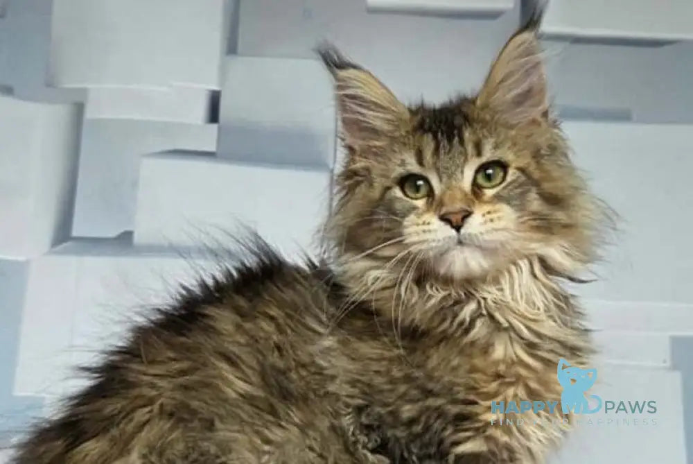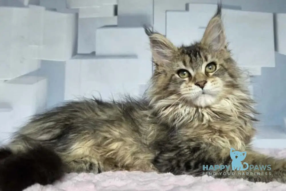 Kama is a majestic female Maine Coon with a striking black ticked tabby coat. Known for their large size and tufted ears, Maine Coons combine a distinctive appearance with a gentle and intelligent temperament. Kama’s well-defined tabby pattern highlights her natural elegance, making her an exceptional example of the breed’s beauty and charm. Ideal for families or individuals seeking a friendly, affectionate companion with a robust and adaptable nature.