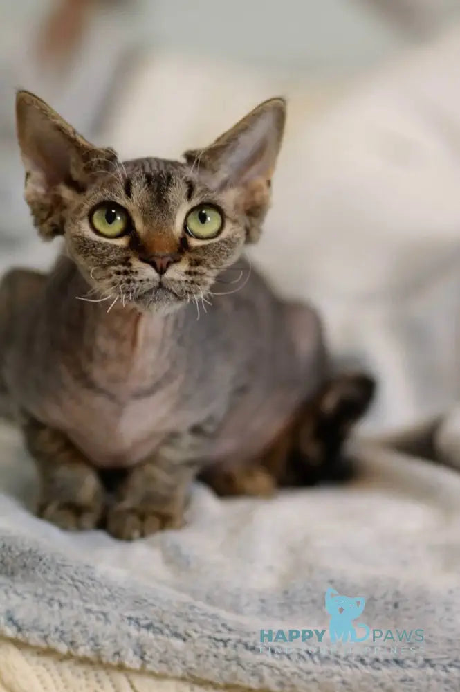 Kate Devon Rex female, black spotted tabby