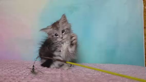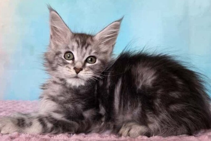 The Katsura Maine Coon female in black silver tabby showcases the breed's distinctive large size, tufted ears, and bushy tail. Her striking tabby pattern highlights the silver undercoat contrasted by bold black markings, emphasizing the breed’s natural beauty. Known for her gentle temperament and intelligence, this Maine Coon offers both an impressive appearance and a calm, affectionate nature, making her an excellent companion for families and experienced cat enthusiasts alike.