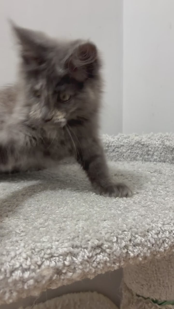 Meet Kim, a stunning blue tortoiseshell Maine Coon female with the breed's signature gentle temperament and impressive size. This majestic feline features the distinctive blue-gray and cream coloring characteristic of tortoiseshell patterns, combined with the Maine Coon's luxurious long coat and tufted ears. Known for their intelligence, playfulness, and affectionate nature, Maine Coons make wonderful family companions. Kim's striking appearance and loving personality make her an exceptional addition to any home seeking a devoted, interactive pet.