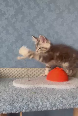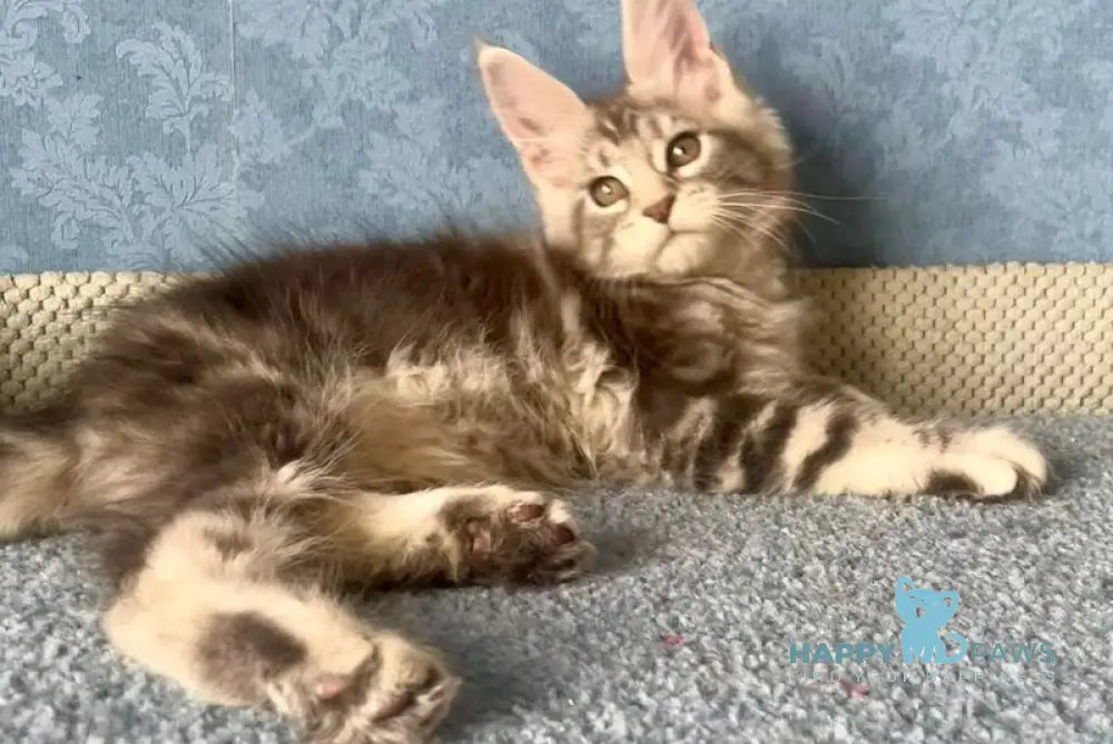 The Kiski Maine Coon female in black silver tabby showcases the breed’s signature large, muscular frame and luxurious, dense coat with striking silver tabby markings. Known for its gentle temperament and intelligence, this cat combines majestic appearance with affectionate personality, making her an excellent companion for both families and enthusiasts seeking a high-quality pedigree feline. Her robust health and well-structured body reflect careful breeding practices focused on maintaining Maine Coon standards. Ideal for those who appreciate distinctive beauty paired with a calm and social nature.