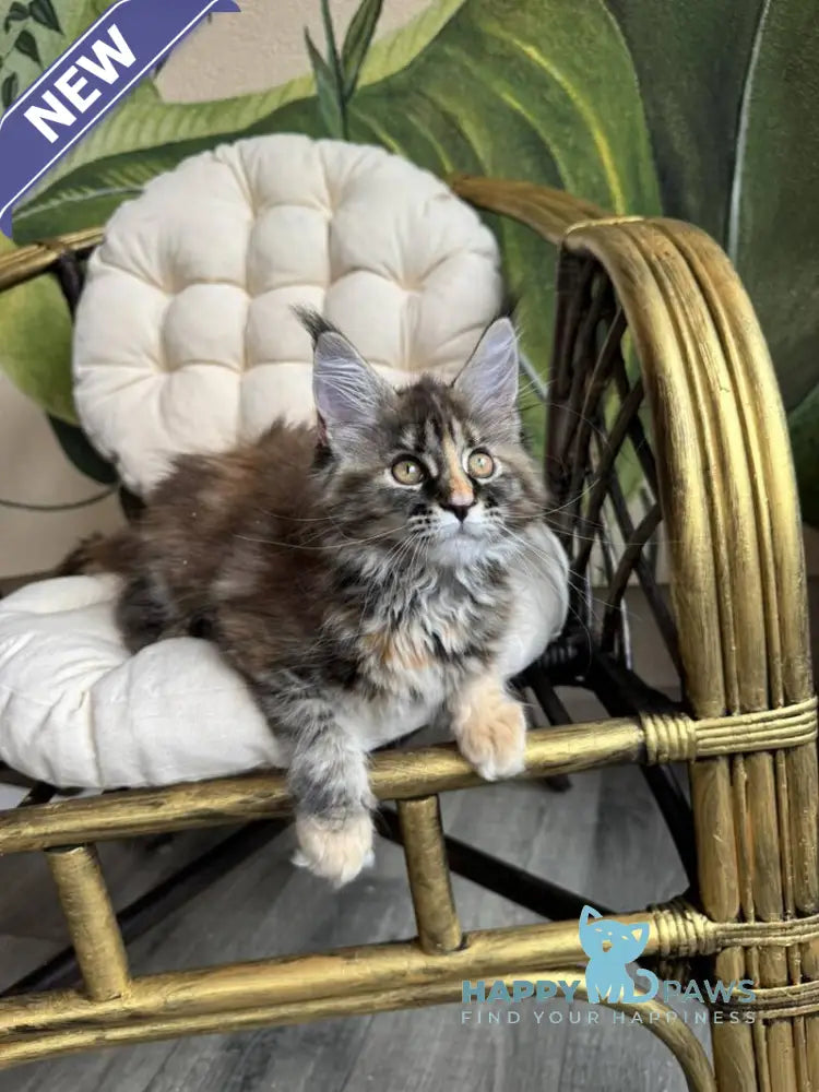 Kleopatra is a stunning female Maine Coon showcasing the breed’s signature large size and luxurious coat. Her black tortie pattern accented with white adds a striking contrast, highlighting her elegant and robust physique. Known for their gentle temperament and intelligence, Maine Coons like Kleopatra make affectionate companions with a playful yet calm demeanor. Her distinctive coloration combined with the breed’s characteristic tufted ears and bushy tail make her an exceptional example of this majestic breed. Perfect for those seeking a sociable and visually captivating feline pet.