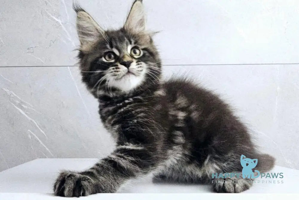 Koks is a distinguished male Maine Coon with a striking black tabby coat, showcasing the breed's characteristic large size and tufted ears. Known for their gentle nature and intelligence, Maine Coons like Koks make excellent companions. His distinctive coloring emphasizes the breed's classic tabby patterns, highlighting his robust physique and thick, water-repellent fur, ideal for cooler climates. Koks combines majestic appearance with friendly temperament, embodying the qualities that make Maine Coons a preferred choice among cat enthusiasts.
