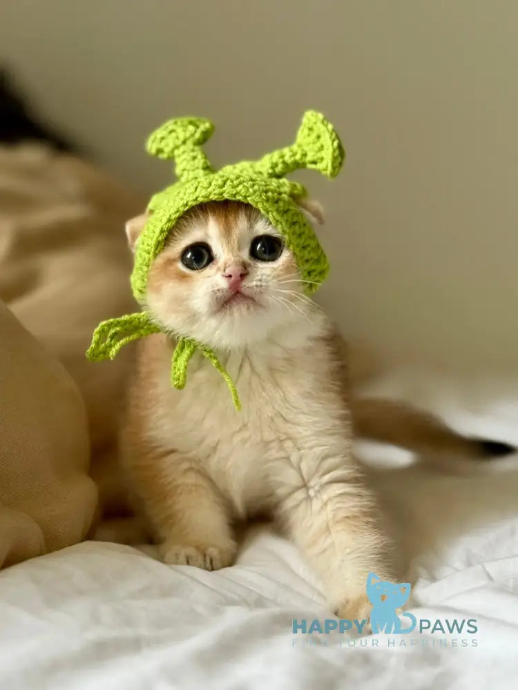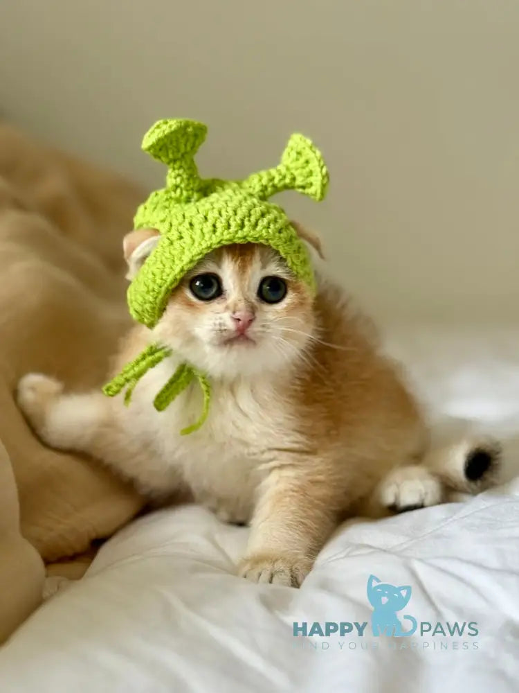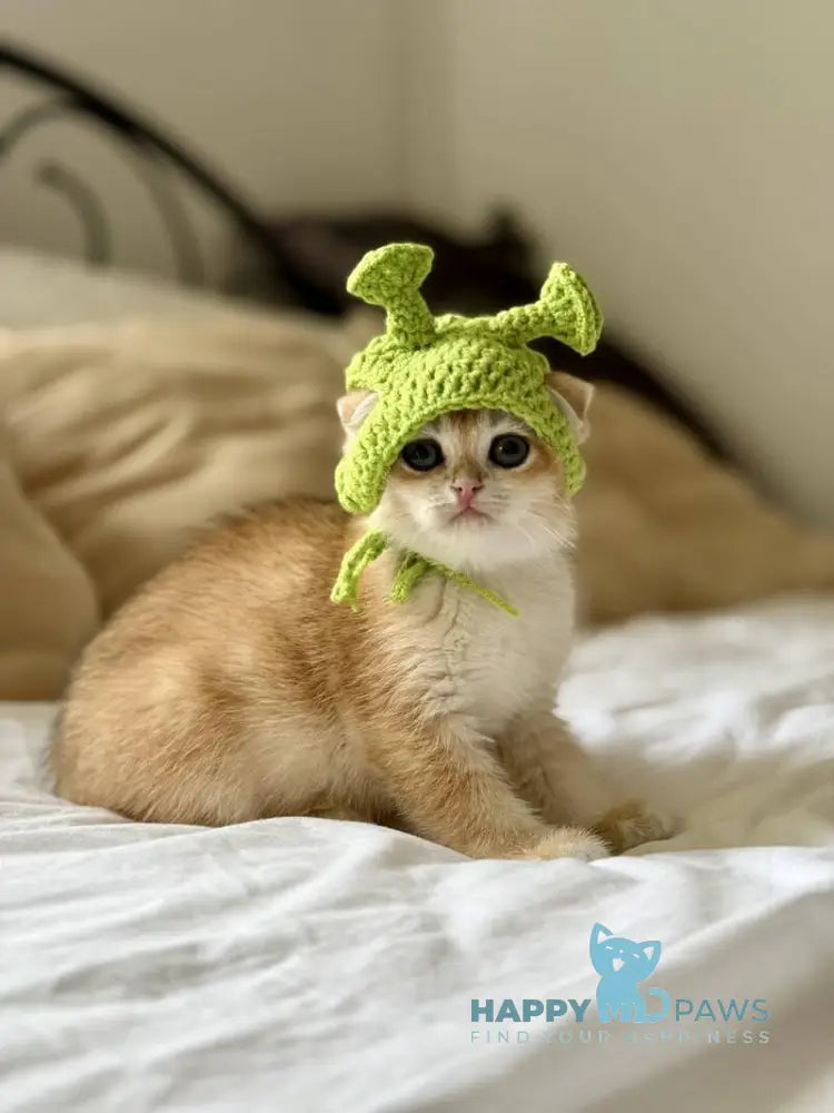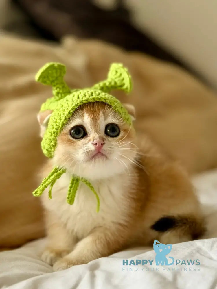 Korra is a female Scottish Fold with a radiant black golden chinchilla coat that glows warmly in any light. Her expressive round eyes and folded ears give her a charming, almost doll-like appearance. She enjoys quiet companionship, often settling nearby to observe her surroundings with calm curiosity. Gentle and affectionate, Korra brings a soothing presence to any home.