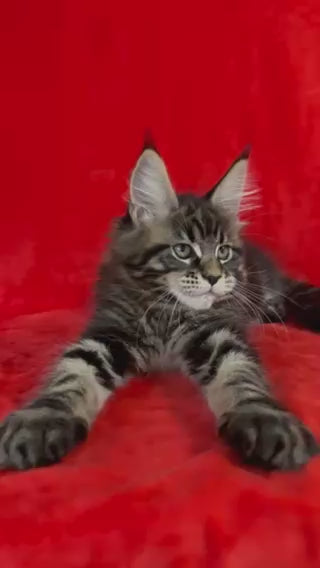 Meet Kuba, a stunning black tabby Maine Coon female with the breed's signature elegance and commanding presence. Maine Coons are renowned for their impressive size, intelligent temperament, and affectionate nature, making them exceptional companions for families and experienced cat enthusiasts alike. Kuba's striking tabby markings showcase the classic beauty of this majestic breed, while her gentle disposition and playful personality promise years of engaging interaction. Maine Coons thrive in environments where they can explore, climb, and interact with their human companions. Kuba represents the finest qualities of this beloved breed—a loyal, sociable, and captivating feline ready to become a cherished member of your household.