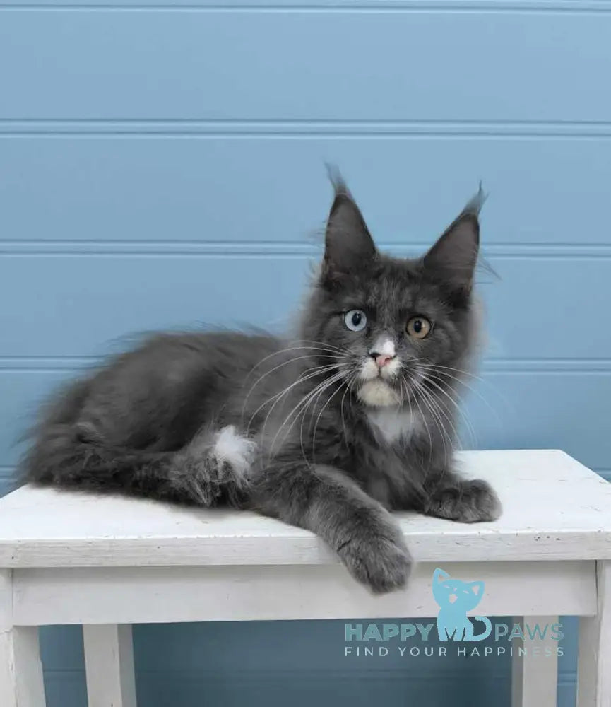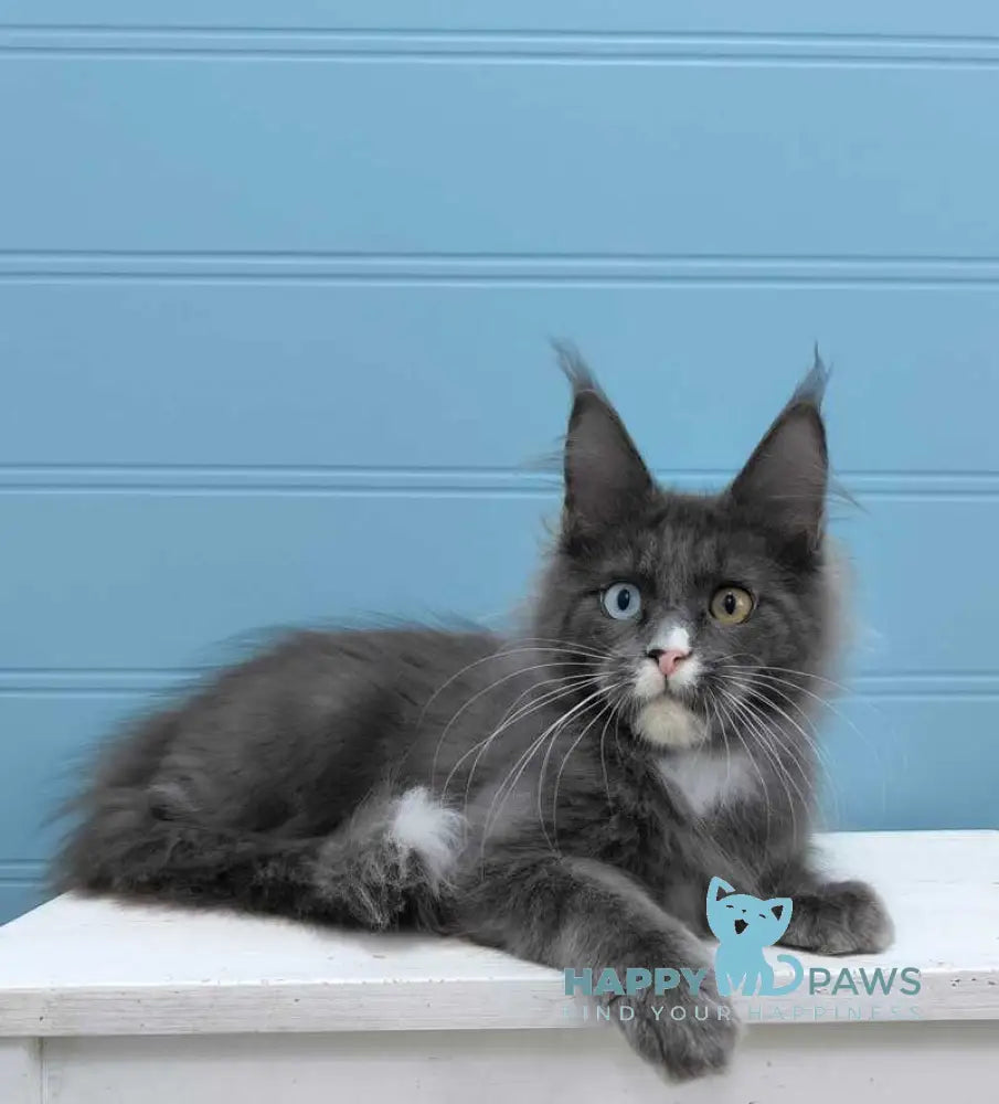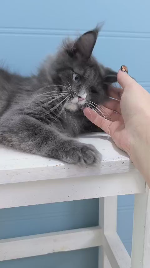 Kyle is a striking Maine Coon male with a captivating blue silver coat accented by crisp white markings. This majestic breed exemplifies the Maine Coon's renowned characteristics: substantial size, muscular build, and an intelligent, affectionate temperament. His luxurious long fur requires regular grooming to maintain its lustrous appearance. Kyle's gentle nature and playful disposition make him an excellent companion for families seeking a devoted, interactive pet. As a purebred Maine Coon, he brings the breed's legendary charm, loyalty, and engaging personality to any household.