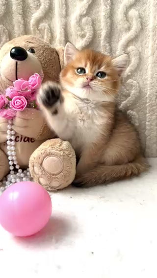 Kylie is a female British Shorthair cat showcasing a distinguished black golden shaded coat, combining classic elegance with a unique color pattern. Known for their calm temperament and robust build, British Shorthairs like Kylie offer both companionship and striking beauty, making her an excellent addition to homes seeking a balanced and sophisticated feline. Her black golden shaded fur highlights the breed’s plush density and lustrous sheen, reflecting superior breeding standards.