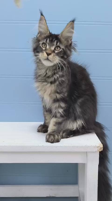 Kyron is a striking male Maine Coon displaying the classic black tabby pattern. This breed is renowned for its impressive size, intelligence, and gentle temperament, making it an excellent choice for families seeking a devoted companion. Maine Coons are known for their playful, social nature and adaptability to various living environments. Kyron's distinctive tabby markings showcase the breed's natural beauty, while his Maine Coon heritage promises a loyal, affectionate personality. Ideal for those who appreciate a larger, interactive feline with a calm disposition and engaging presence.