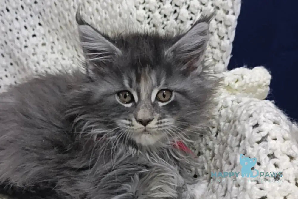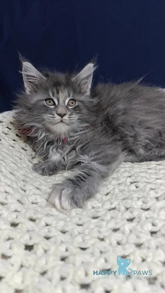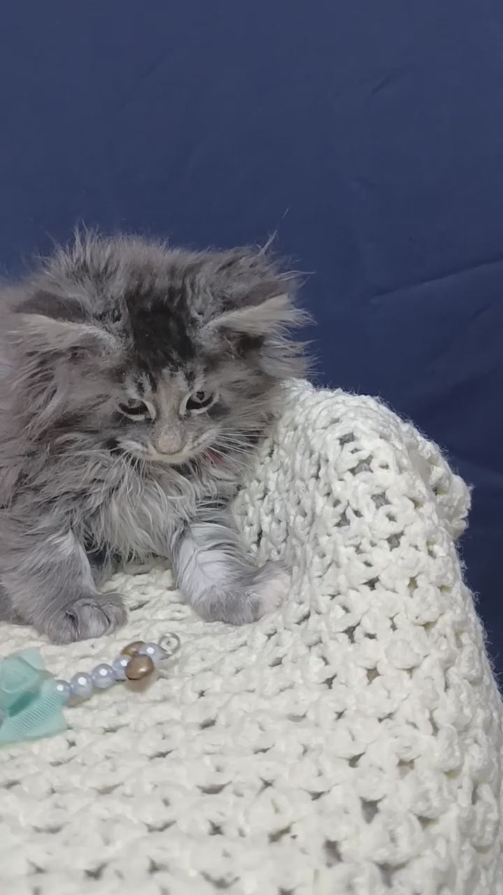 Laura is an exquisite blue tortie silver tabby female with the refined elegance of a Maine Coon. Her soft blend of blue, cream, and silver creates a beautifully marbled coat full of depth and contrast. With her graceful posture and tufted ears, she radiates quiet sophistication. Gentle and affectionate, Laura combines striking beauty with a warm and loving temperament.