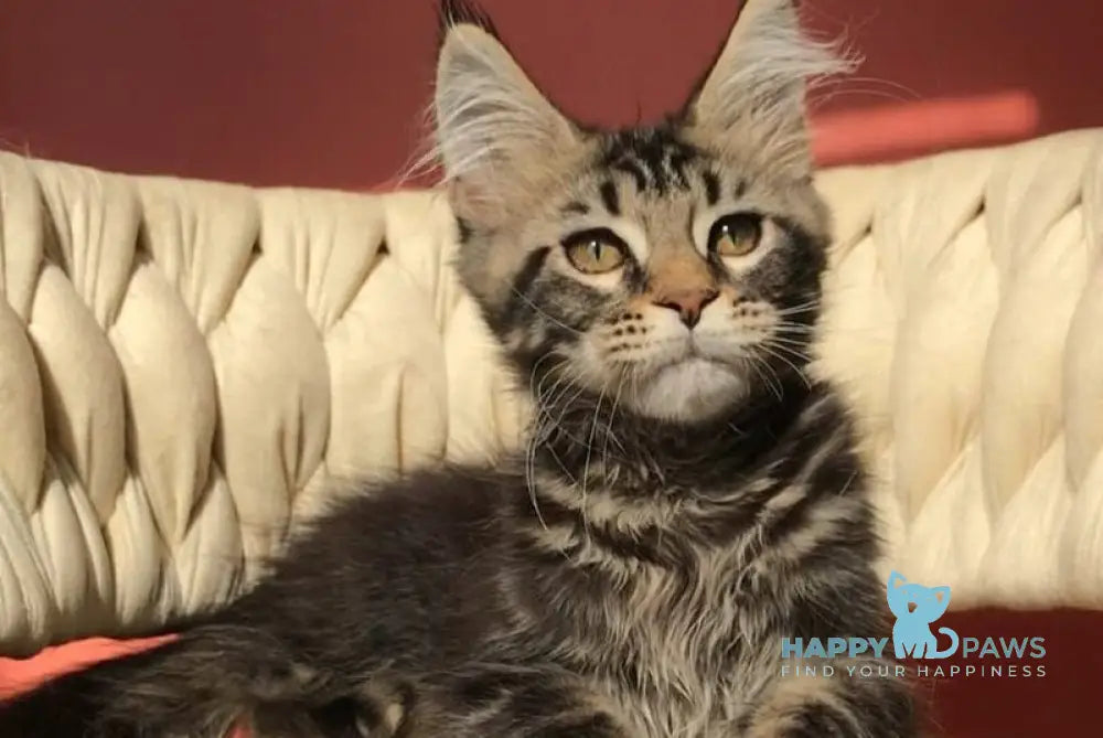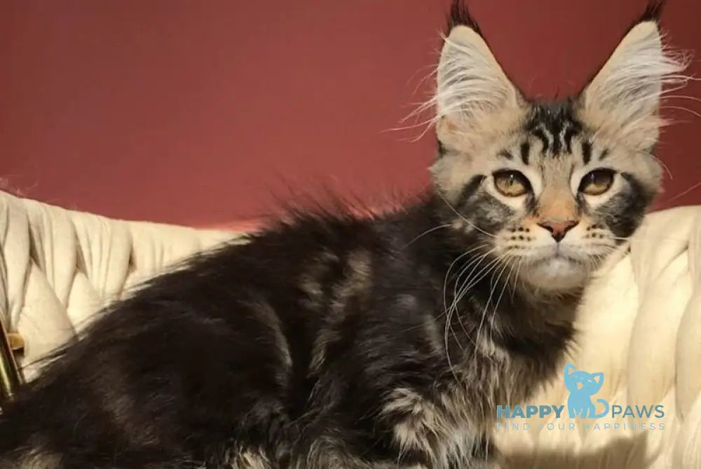 Layala is an exquisite female Maine Coon with a striking black tabby coat, showcasing the breed’s distinctive tufted ears and bushy tail. Known for her gentle temperament and intelligence, Layala embodies the ideal balance of majestic appearance and affectionate nature. Perfect for enthusiasts seeking a regal yet sociable companion, she thrives in attentive homes that appreciate the Maine Coon’s playful and loyal character.