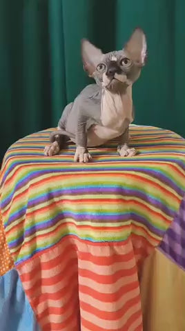 Meet Leia, a stunning Canadian Sphynx female with a striking black bicolour coat. This hairless beauty combines the breed's signature warmth-seeking personality with an elegant, distinctive appearance. Sphynx cats are known for their playful, affectionate nature and love of human companionship. Leia's unique coloring and breed characteristics make her a captivating addition to any home. These intelligent, energetic cats thrive on interaction and attention from their devoted owners.